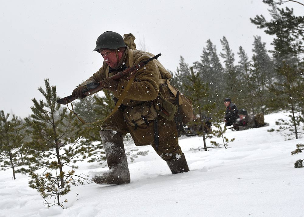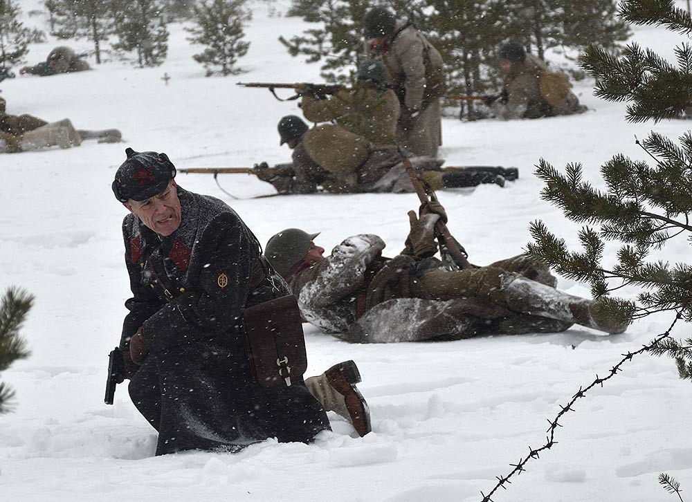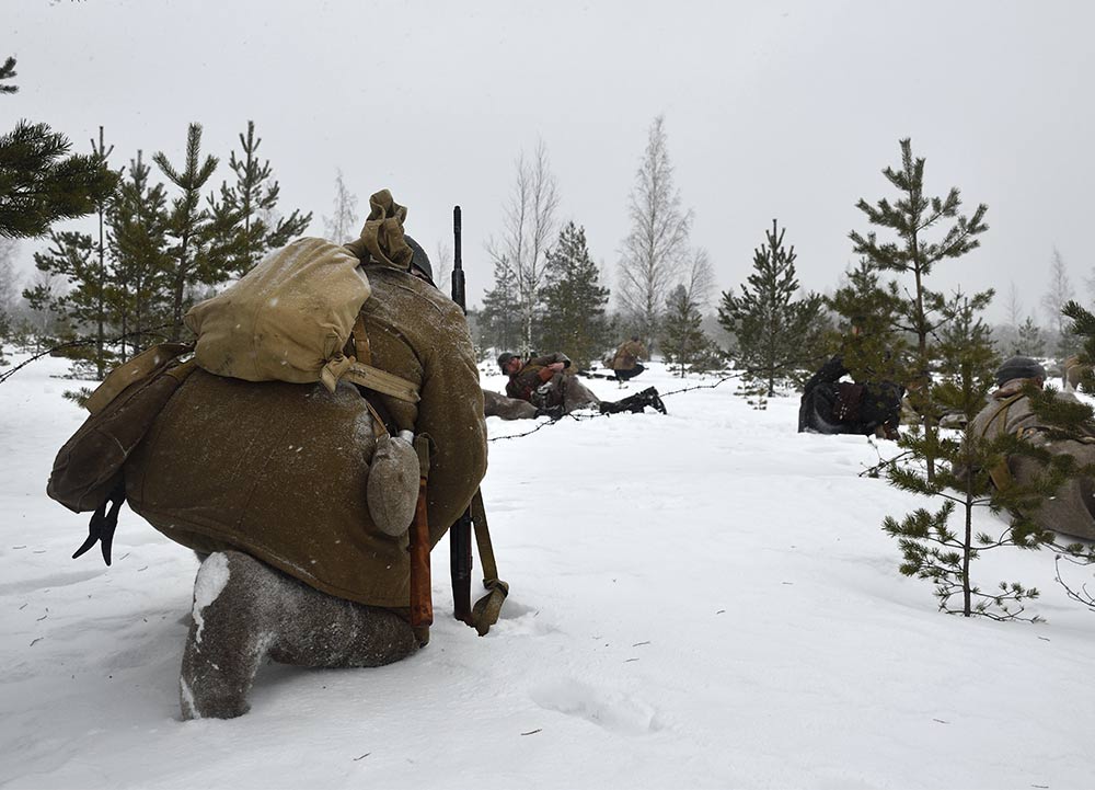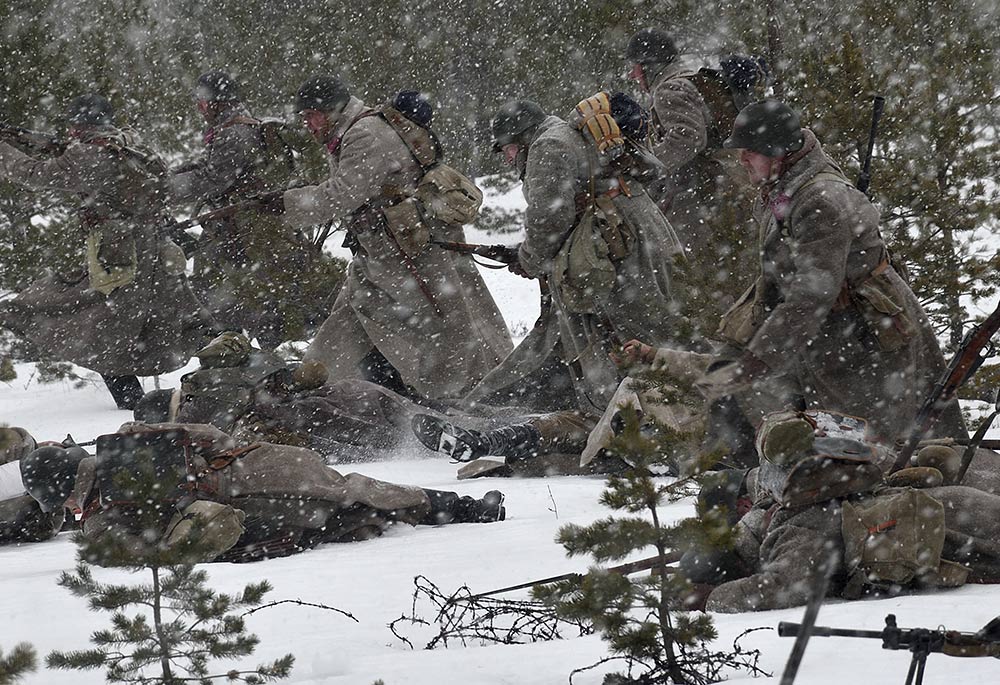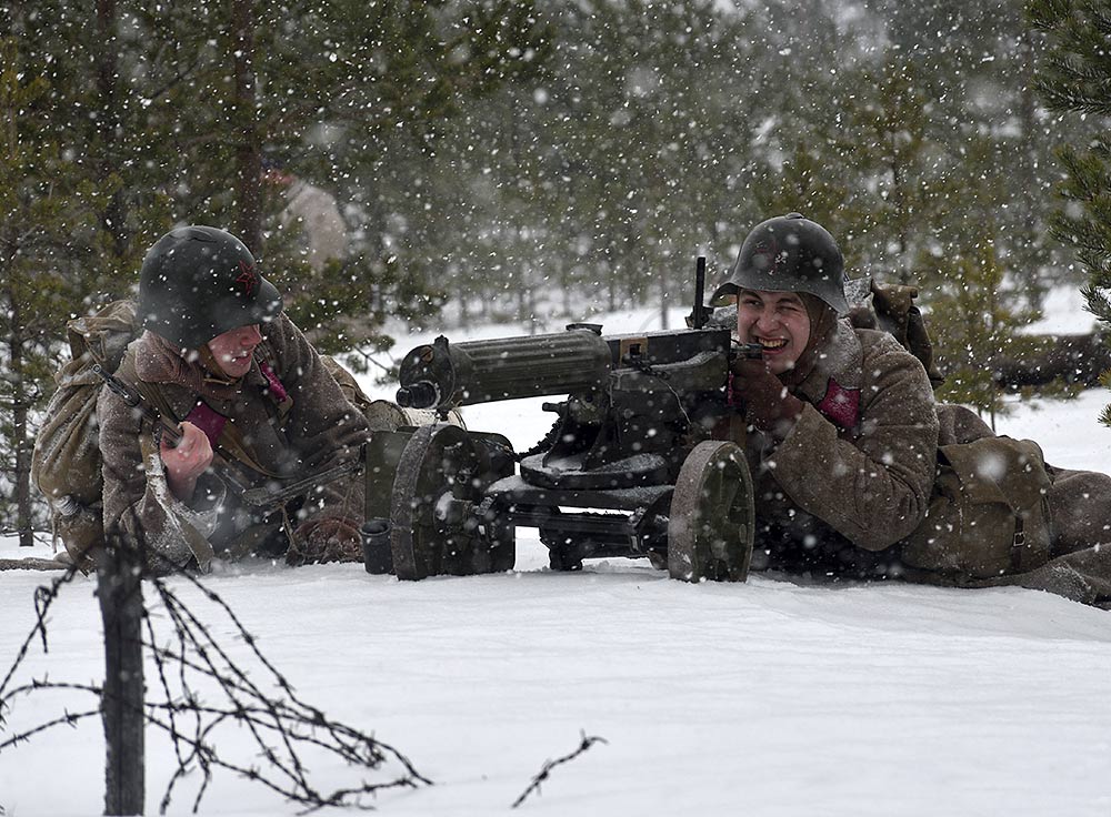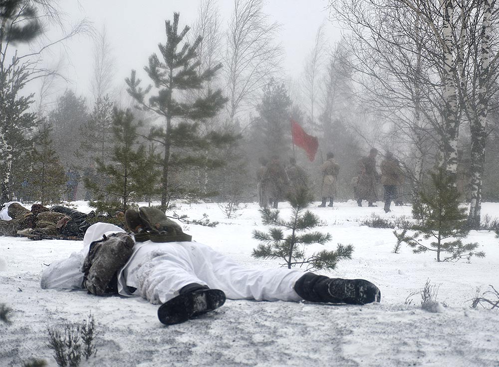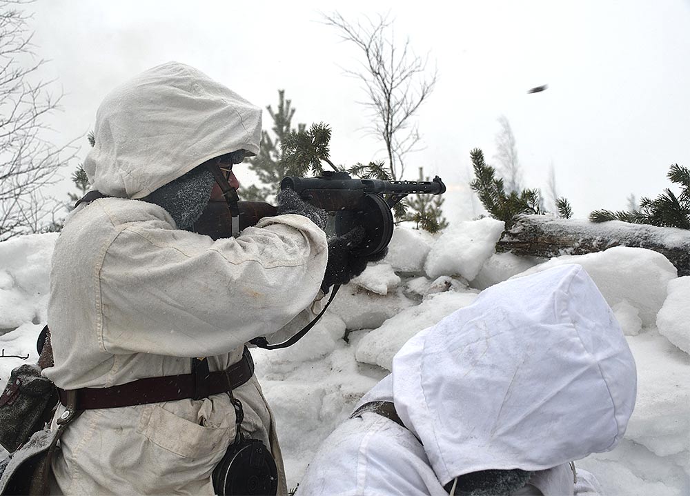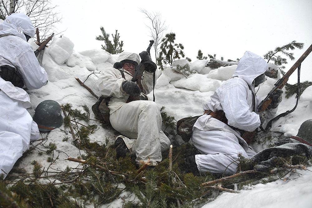 Реконструкция сражения за высоту 65.5 сектора Суммакюлля линии Маннергейма (Зимняя война, 1939-1940). Событие происходило на историческом месте сражения 6 марта 2021 года во время сильной метели...
