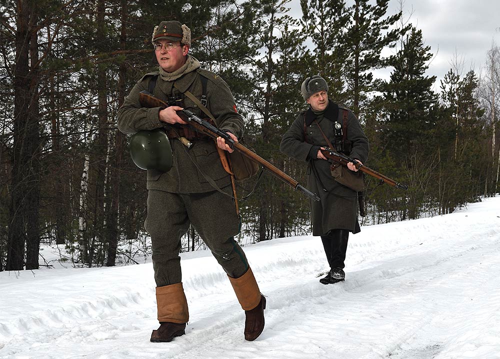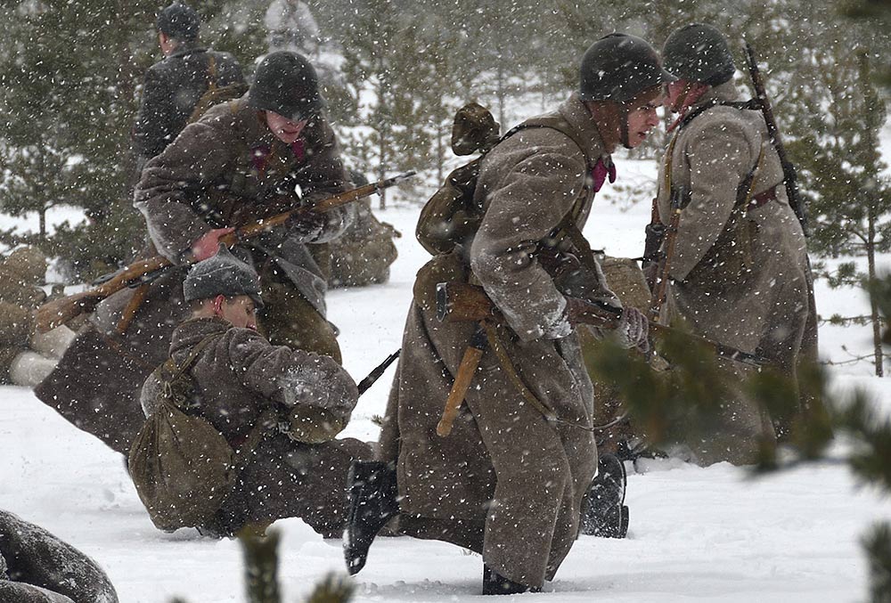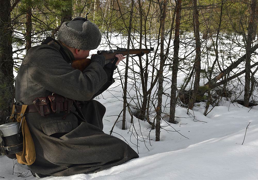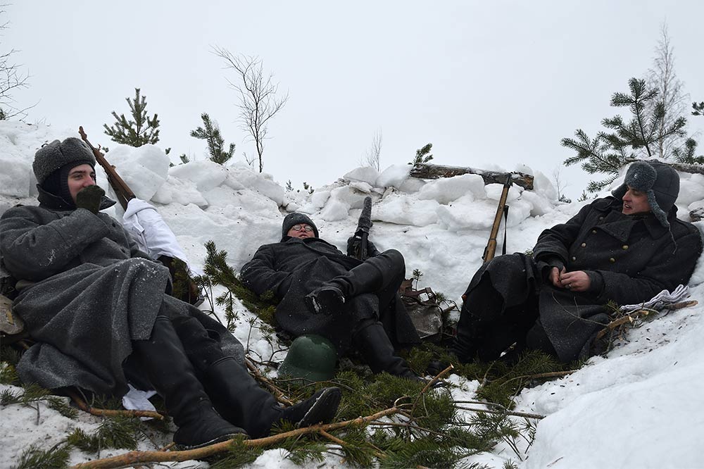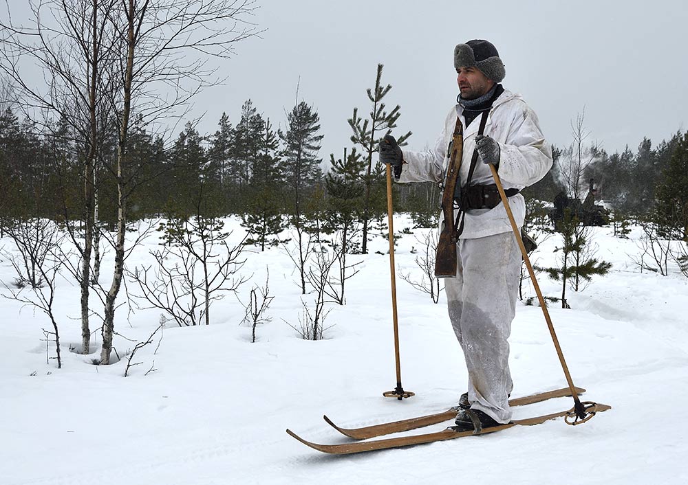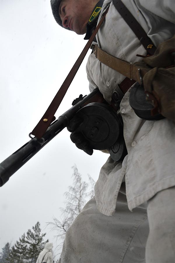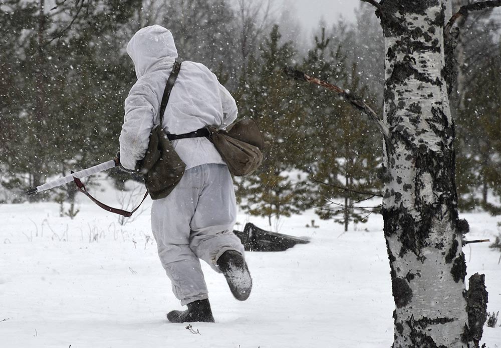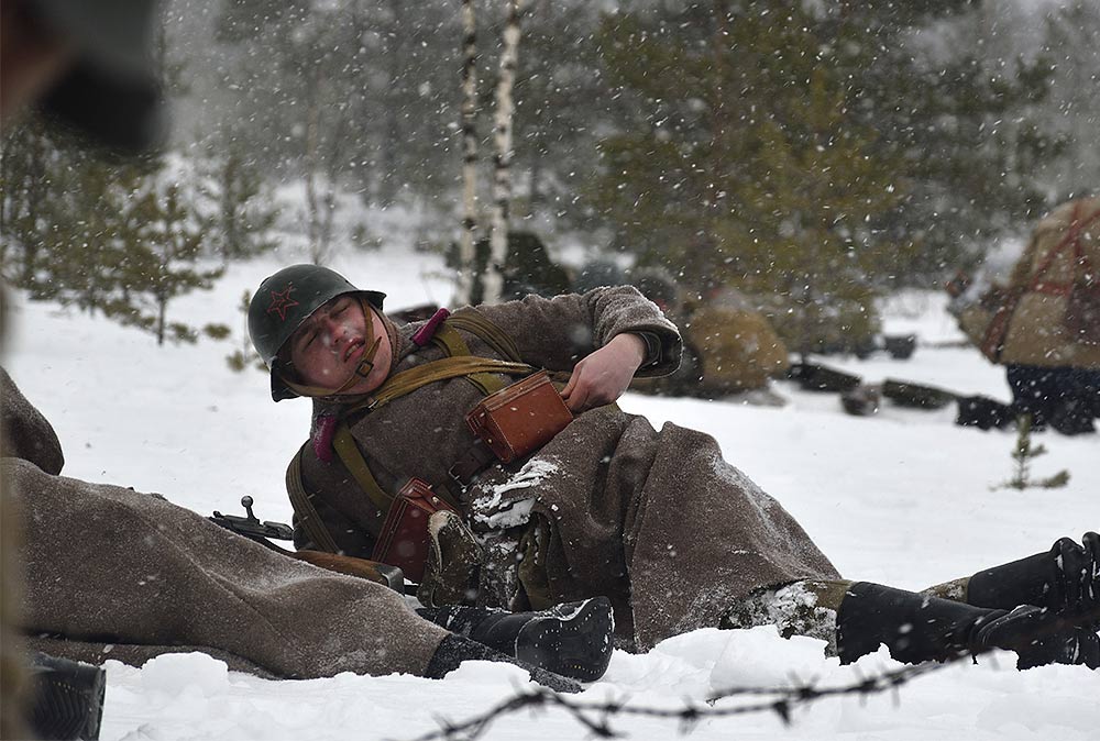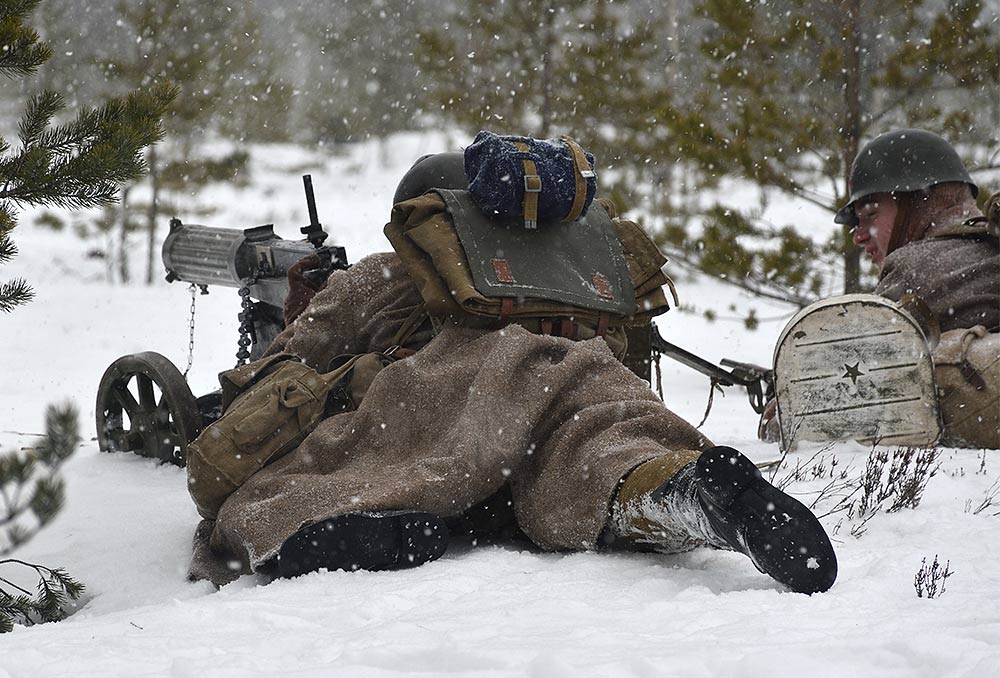 Реконструкция сражения за высоту 65.5 сектора Суммакюлля линии Маннергейма (Зимняя война, 1939-1940). Событие происходило на историческом месте сражения 6 марта 2021 года во время сильной метели...