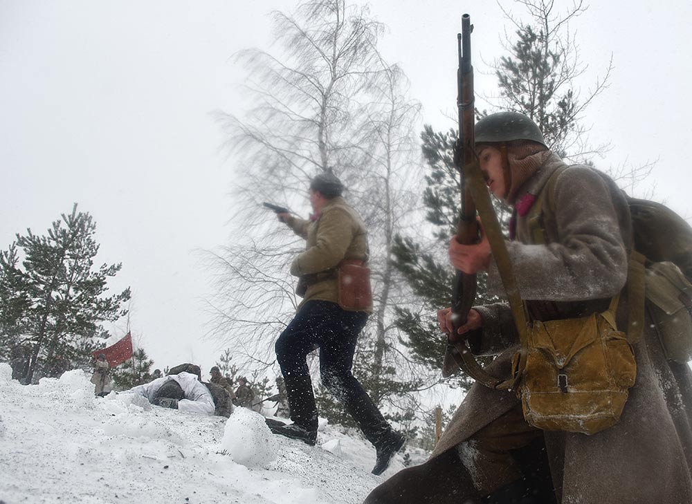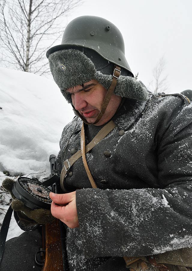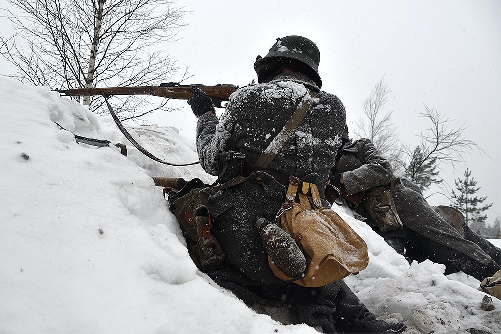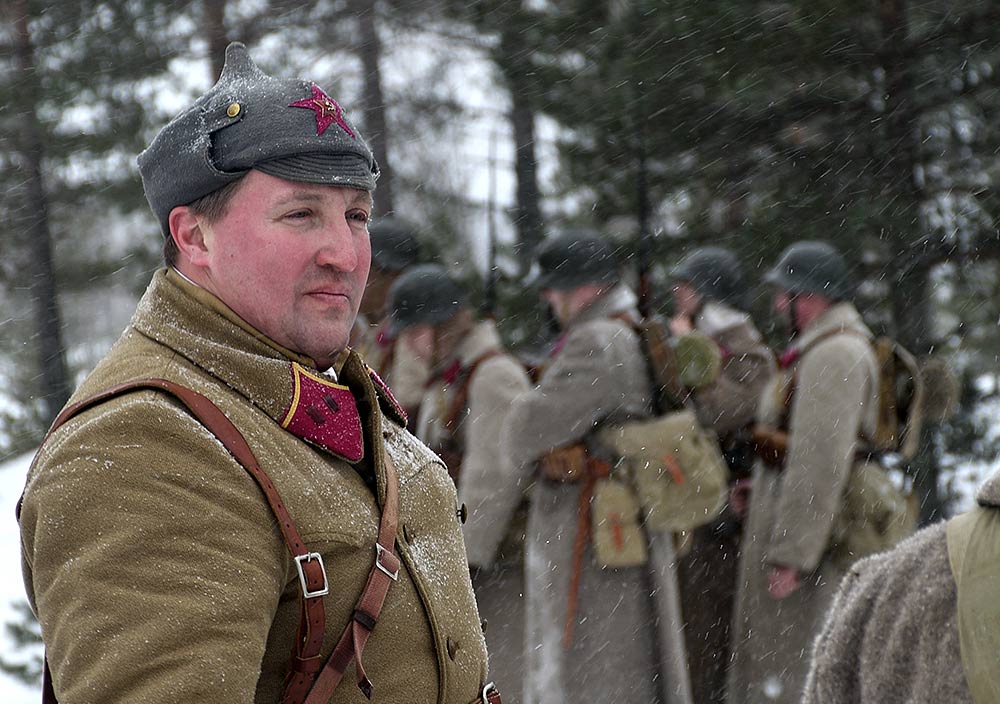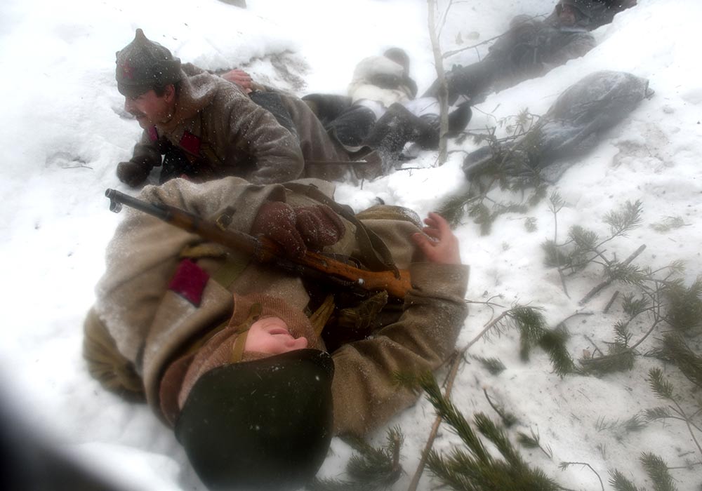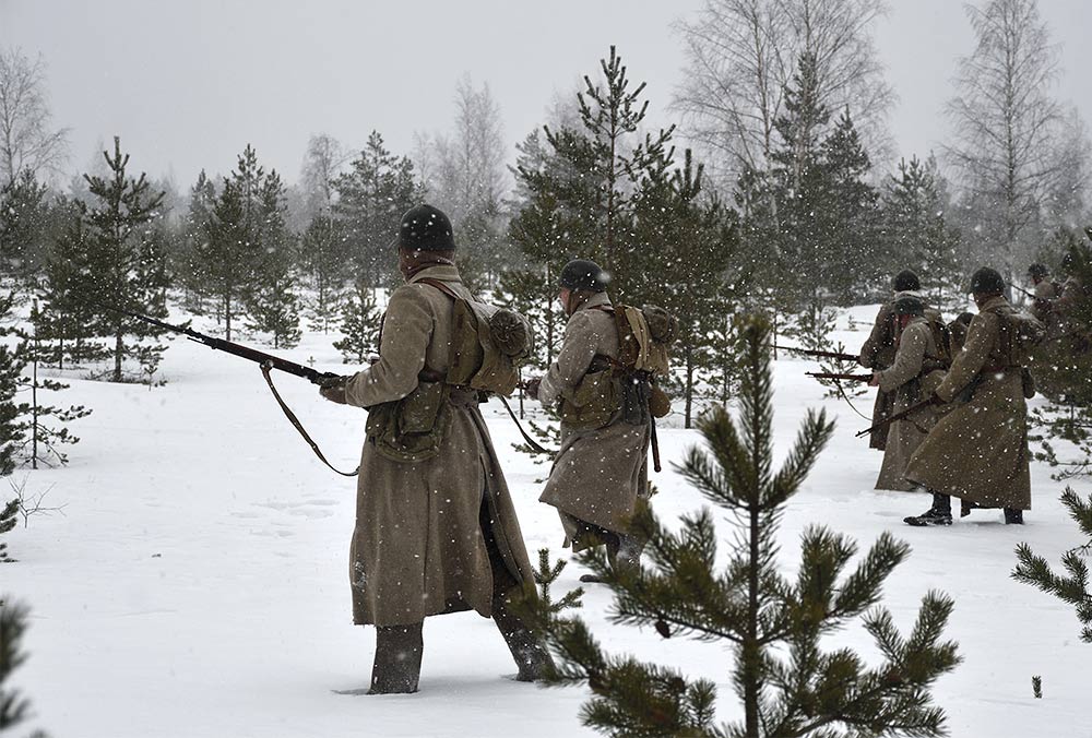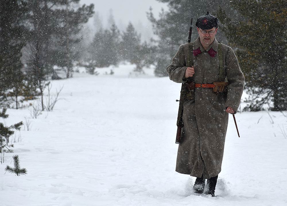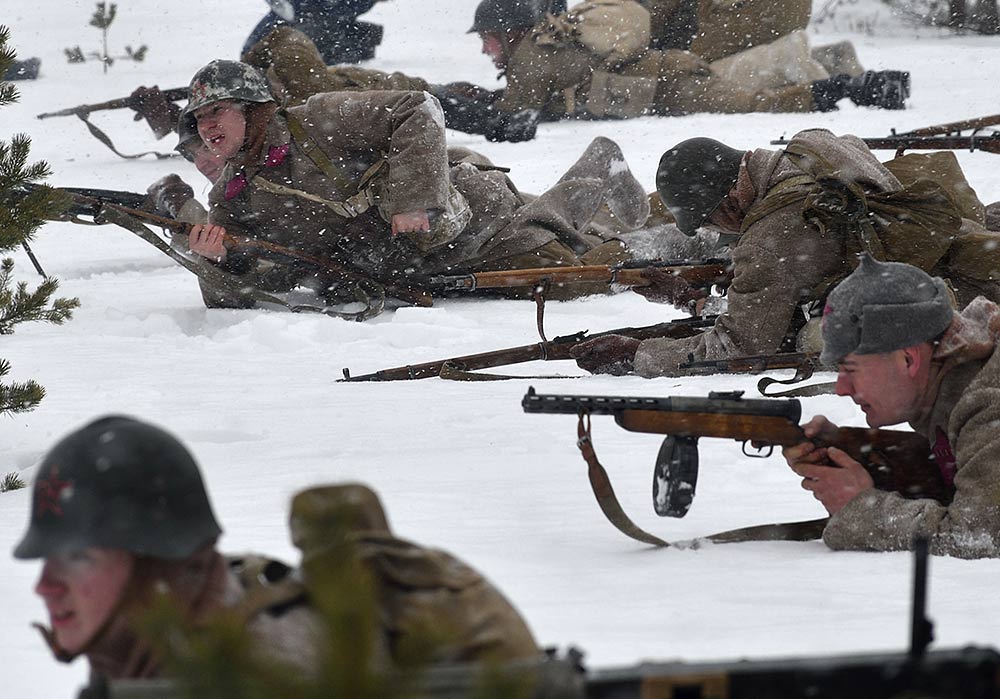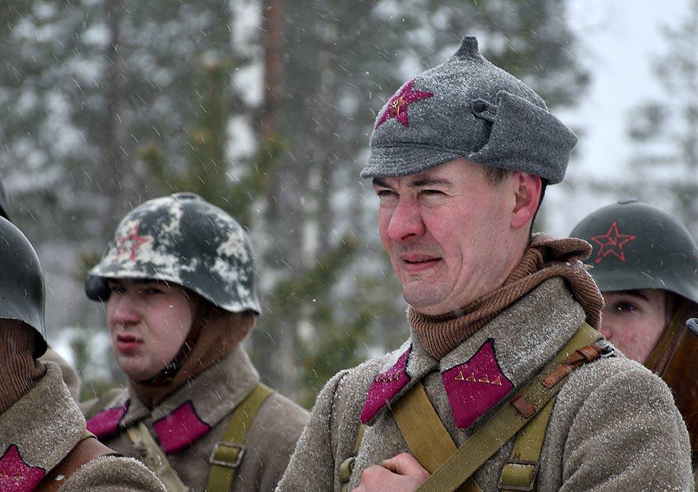 Реконструкция сражения за высоту 65.5 сектора Суммакюлля линии Маннергейма (Зимняя война, 1939-1940). Событие происходило на историческом месте сражения 6 марта 2021 года во время сильной метели...