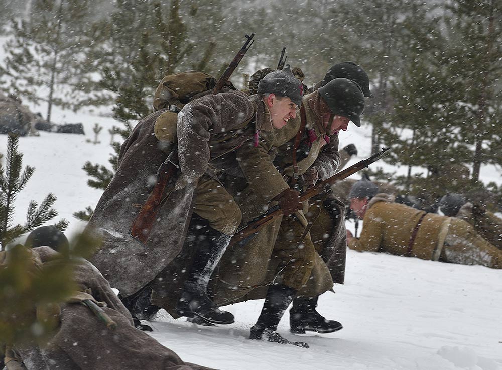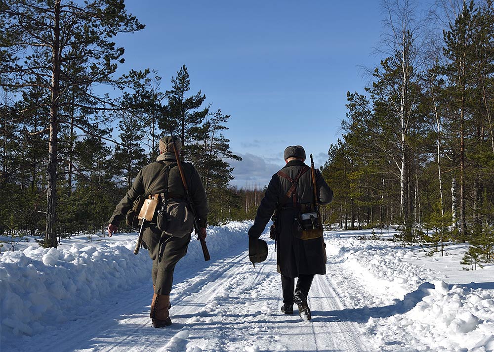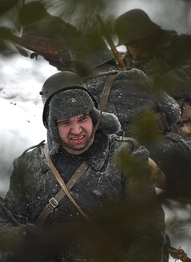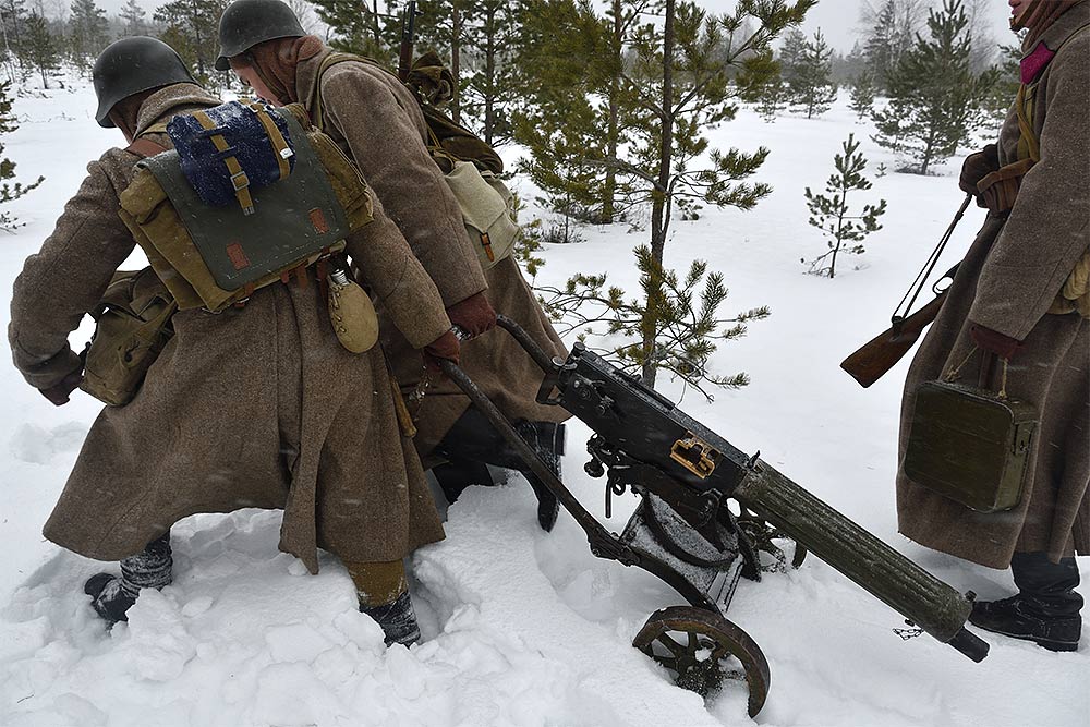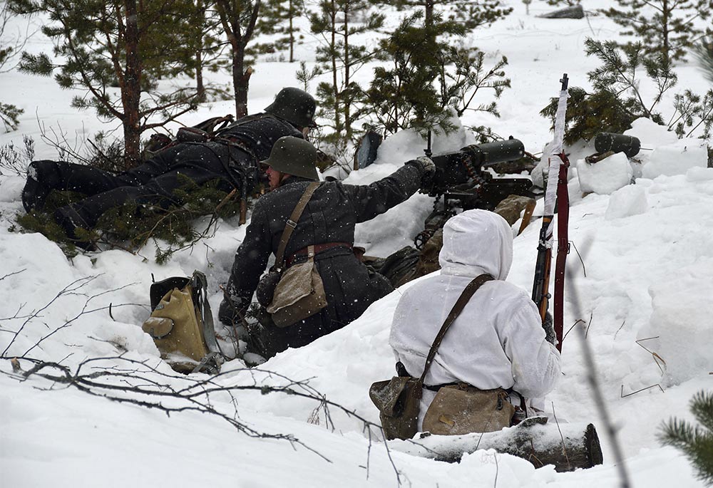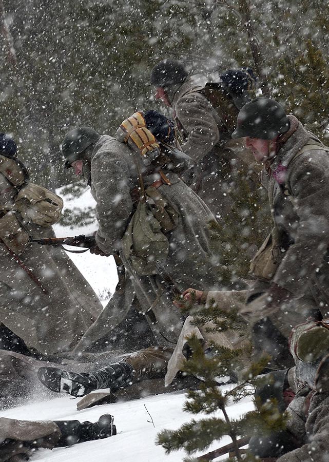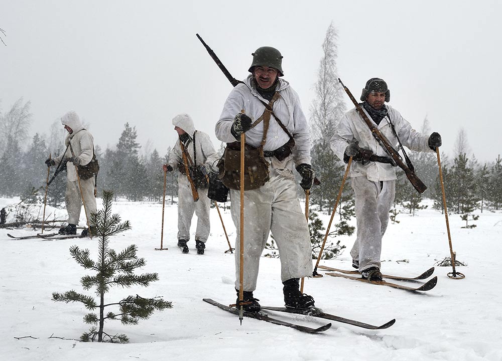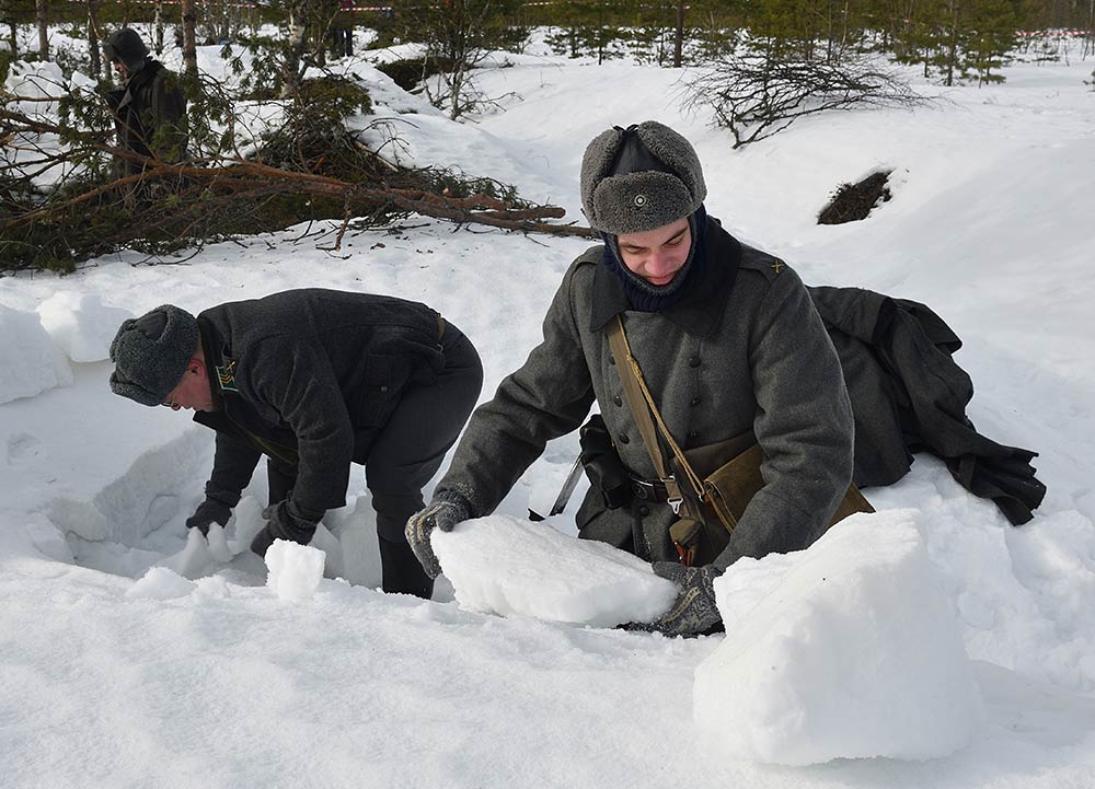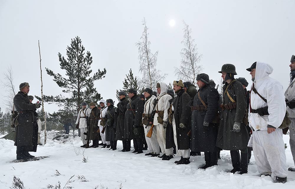Реконструкция сражения за высоту 65.5 сектора Суммакюлля линии Маннергейма (Зимняя война, 1939-1940). Событие происходило на историческом месте сражения 6 марта 2021 года во время сильной метели...