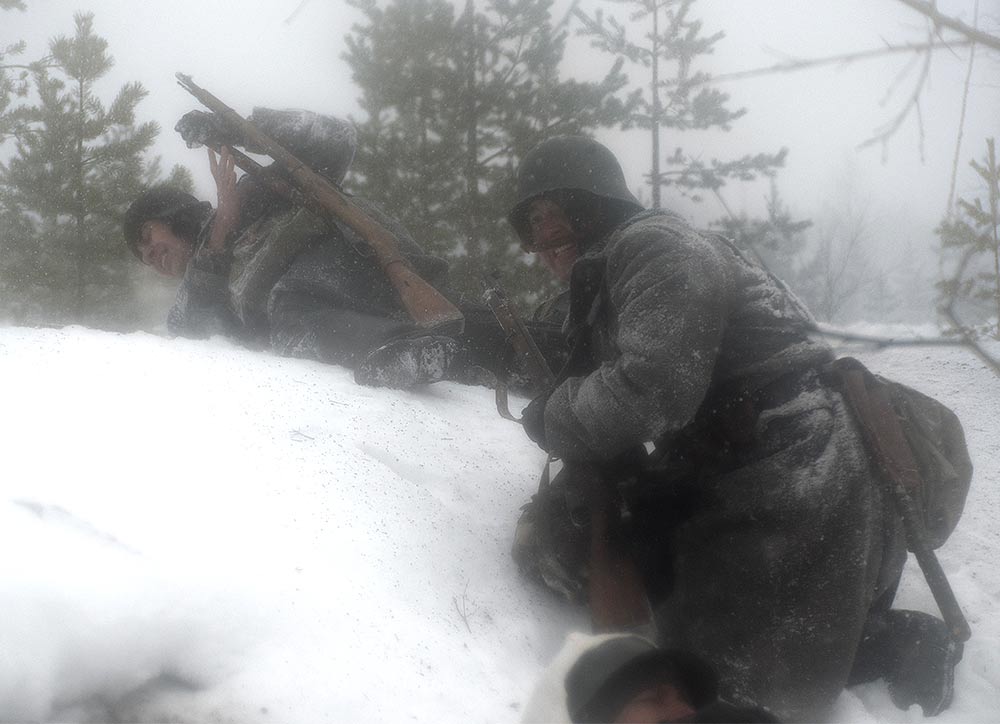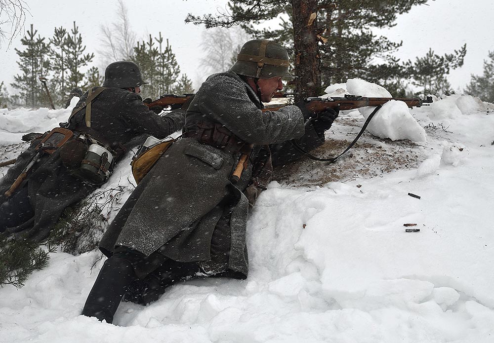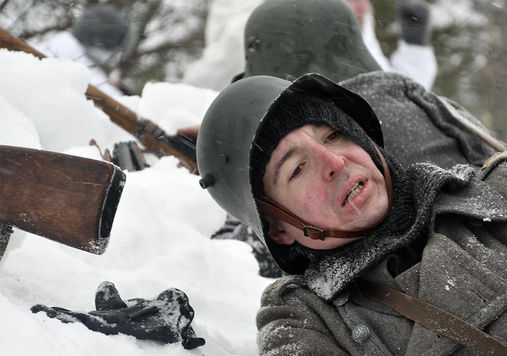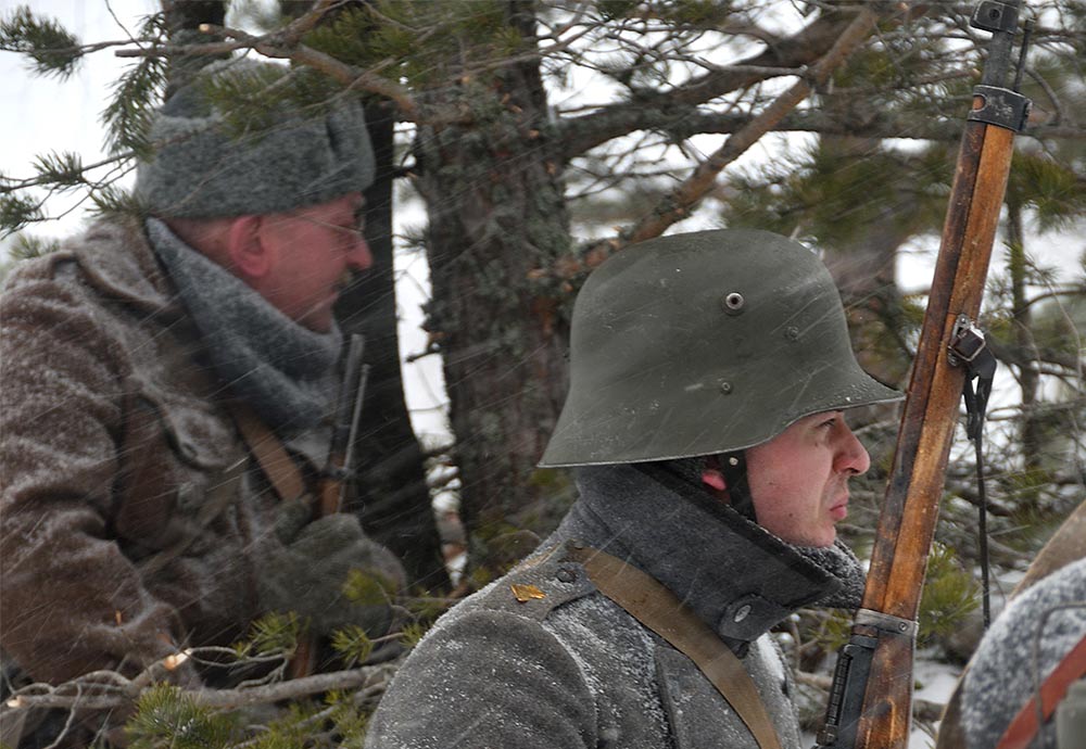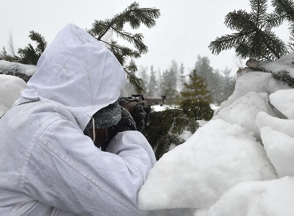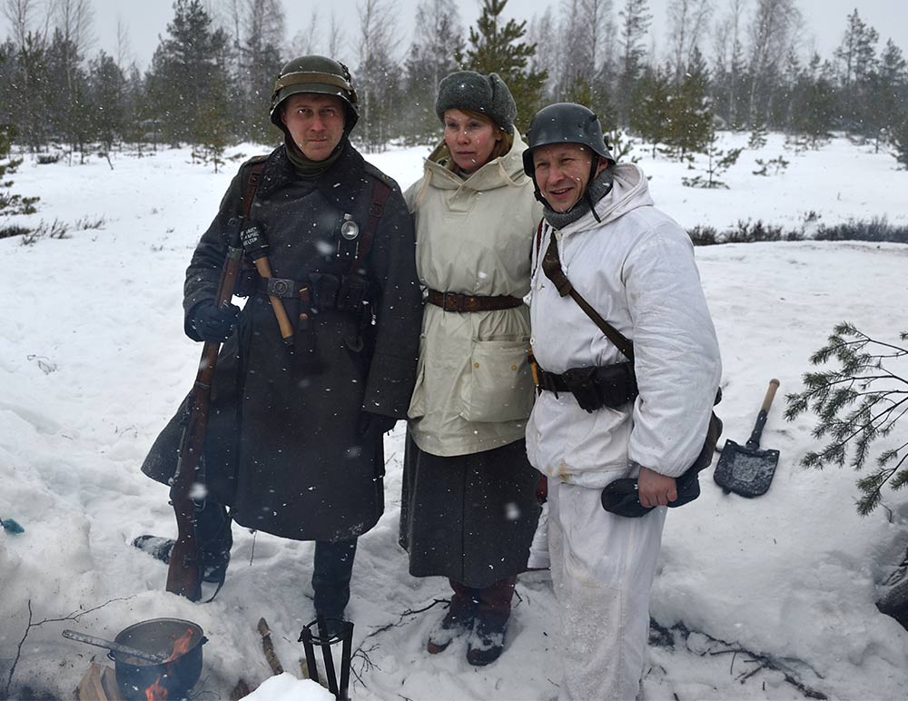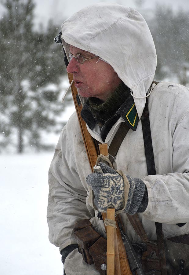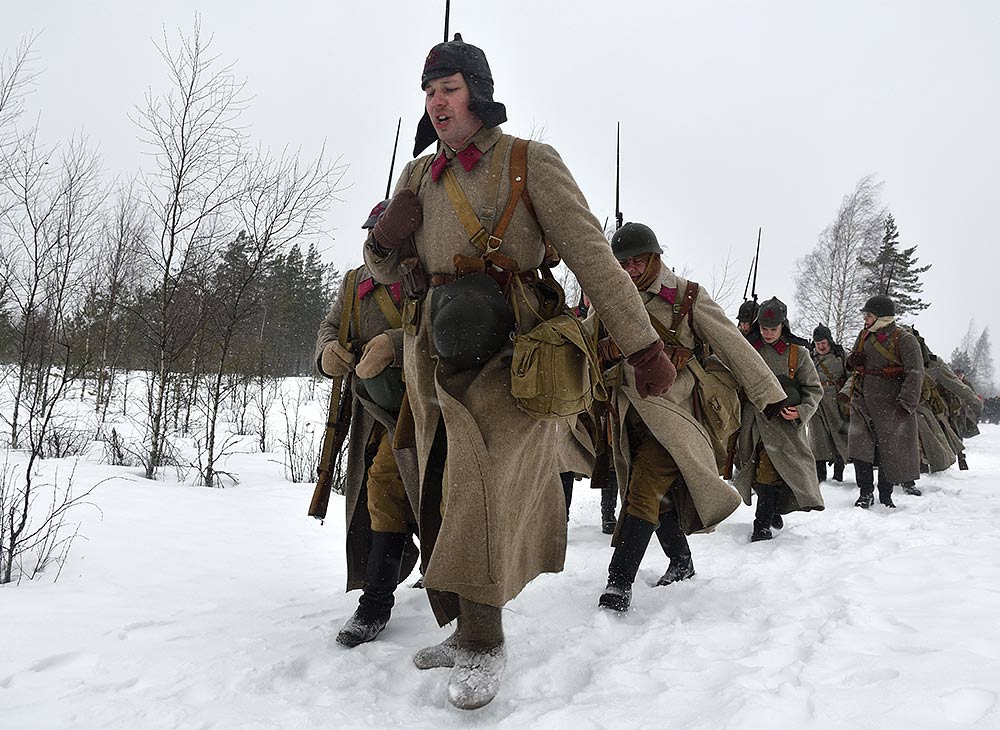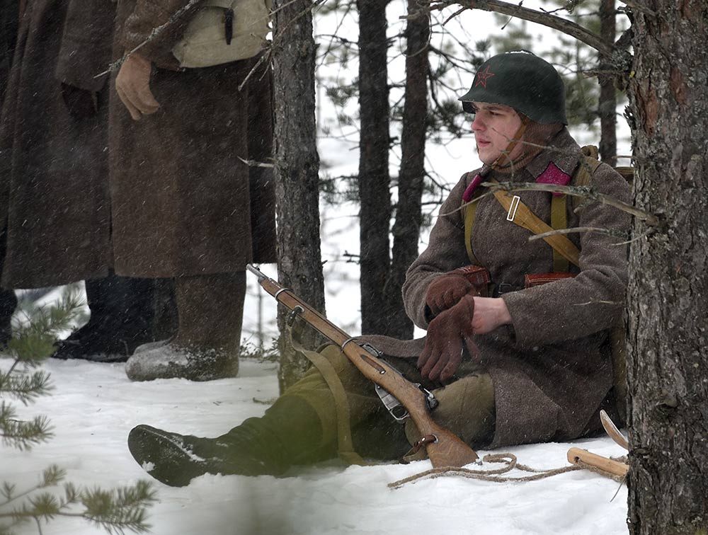 Реконструкция сражения за высоту 65.5 сектора Суммакюлля линии Маннергейма (Зимняя война, 1939-1940). Событие происходило на историческом месте сражения 6 марта 2021 года во время сильной метели...