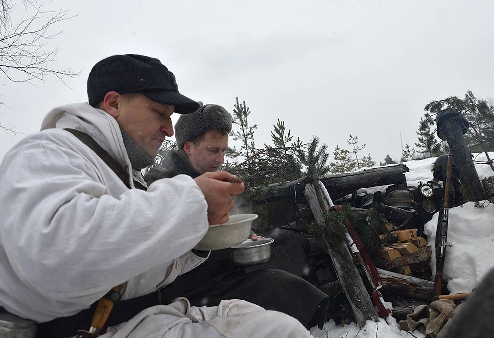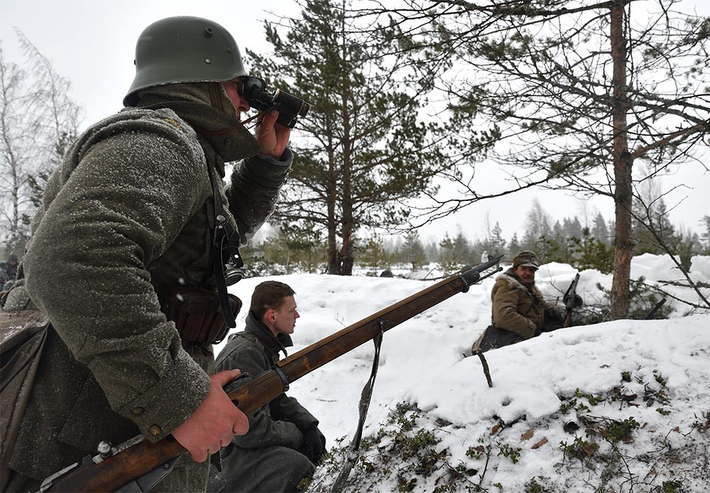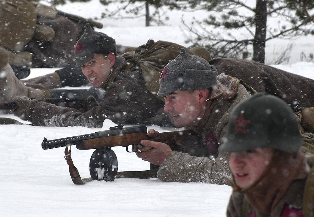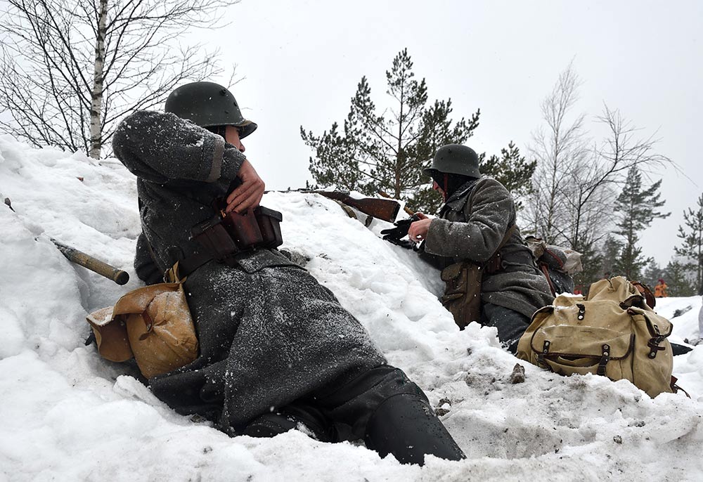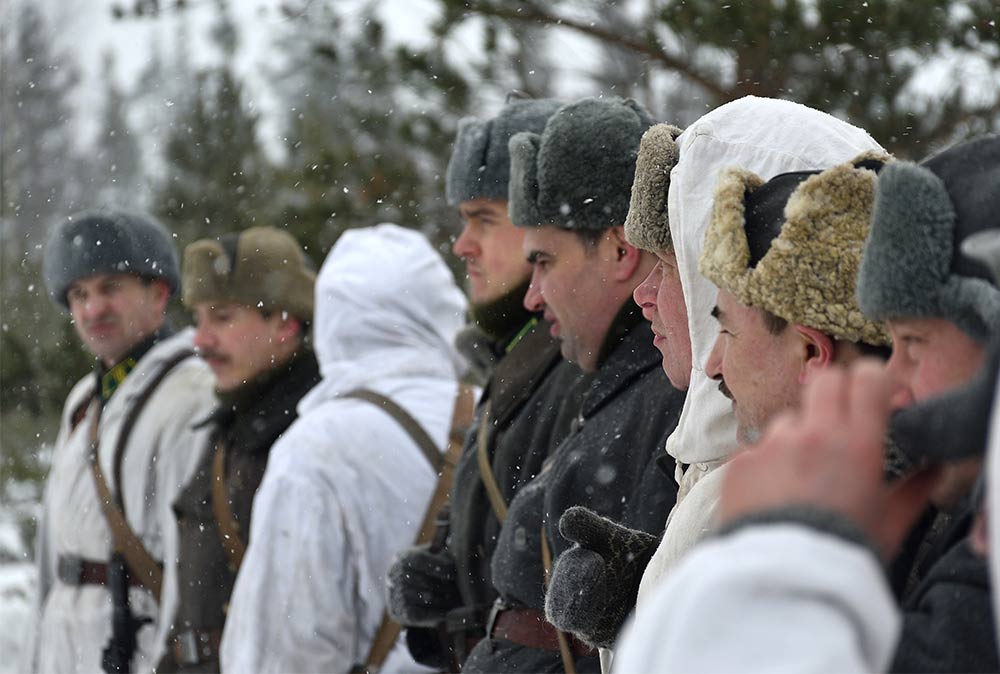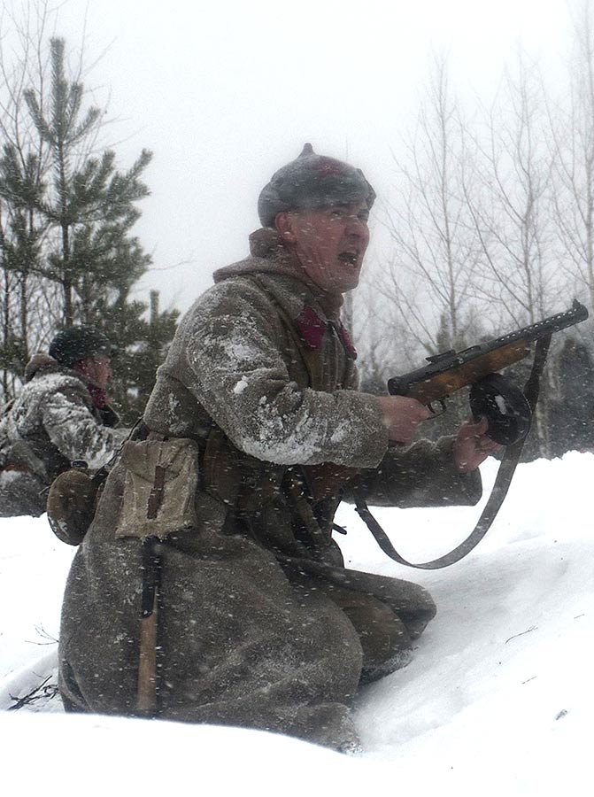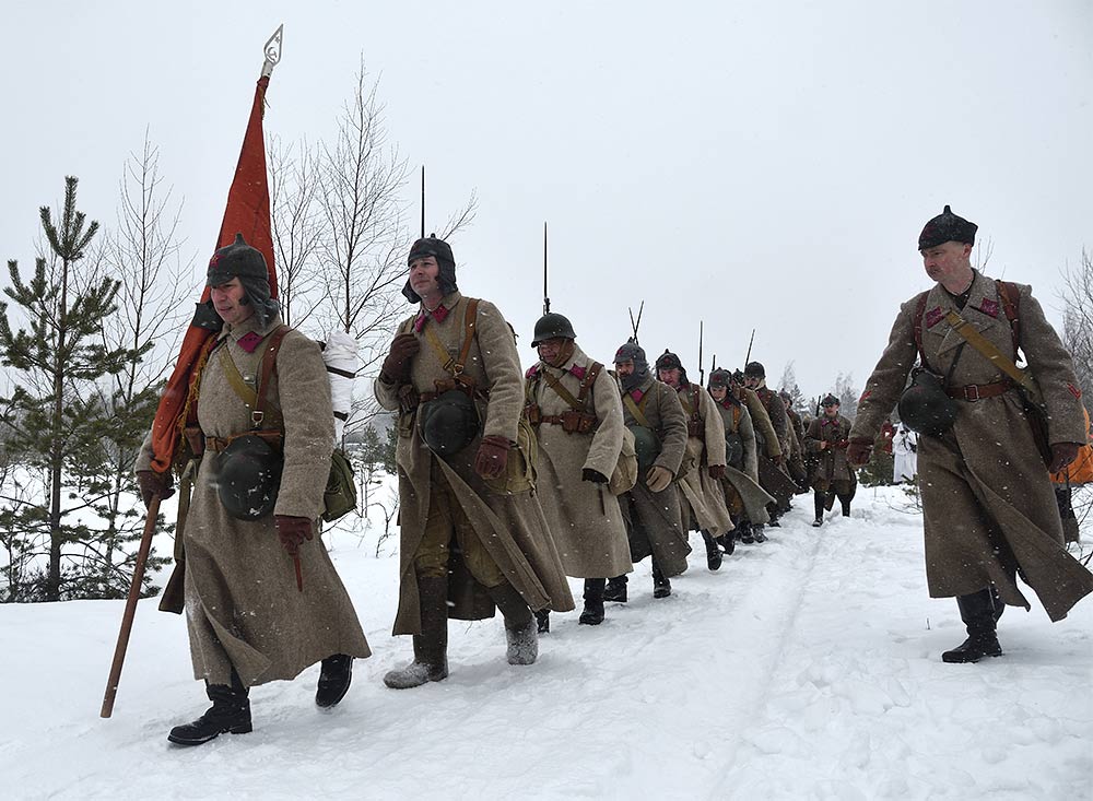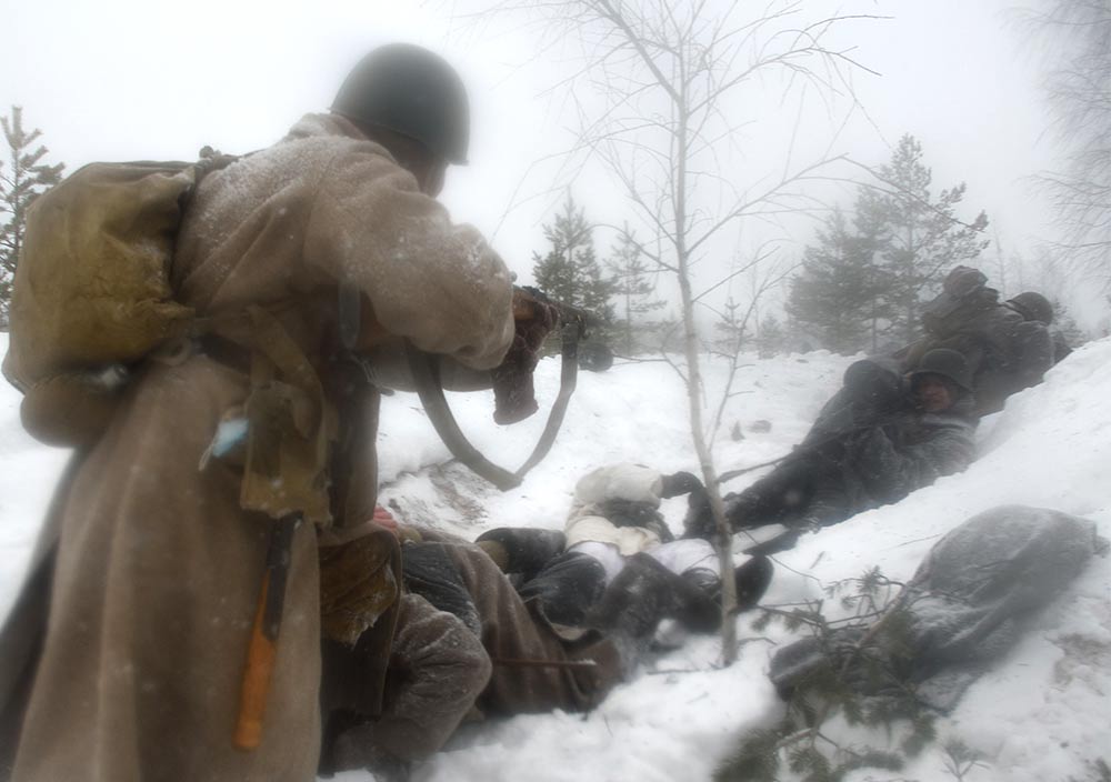 Реконструкция сражения за высоту 65.5 сектора Суммакюлля линии Маннергейма (Зимняя война, 1939-1940). Событие происходило на историческом месте сражения 6 марта 2021 года во время сильной метели...