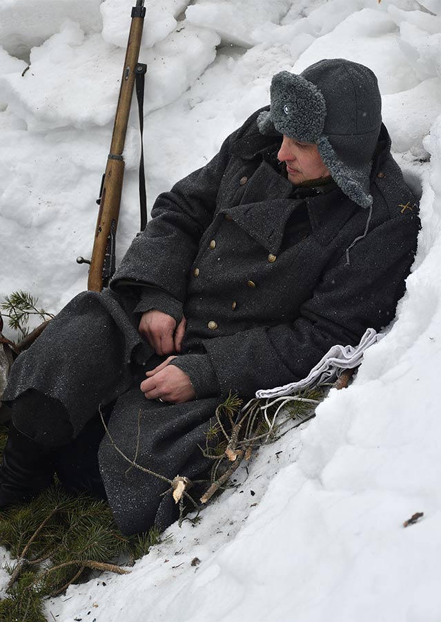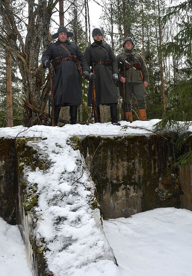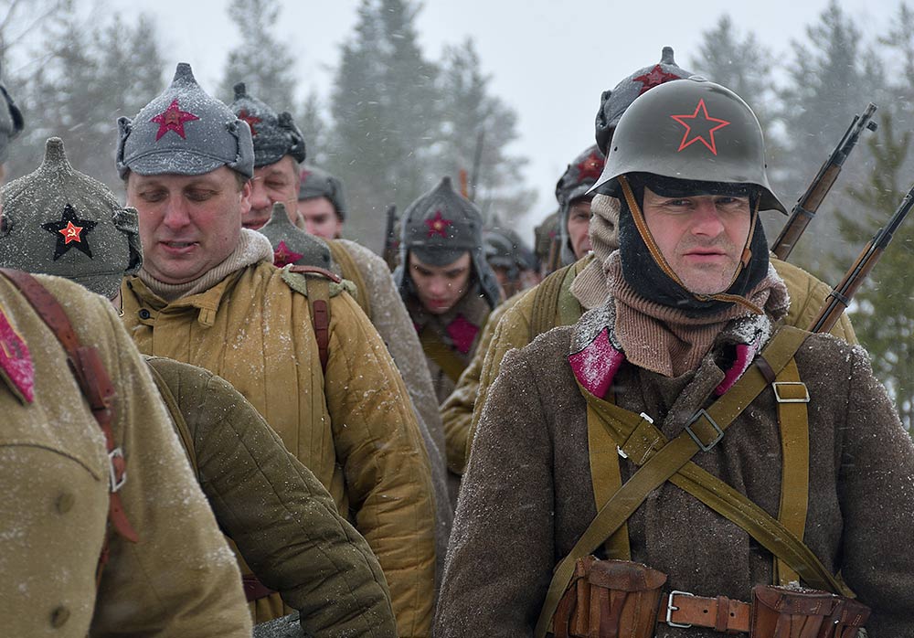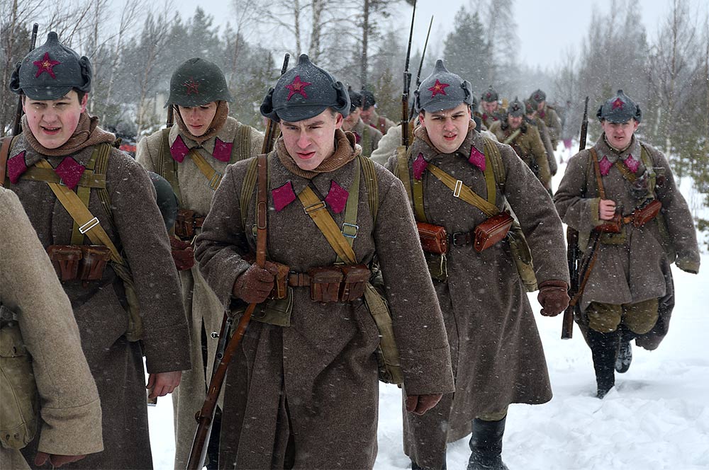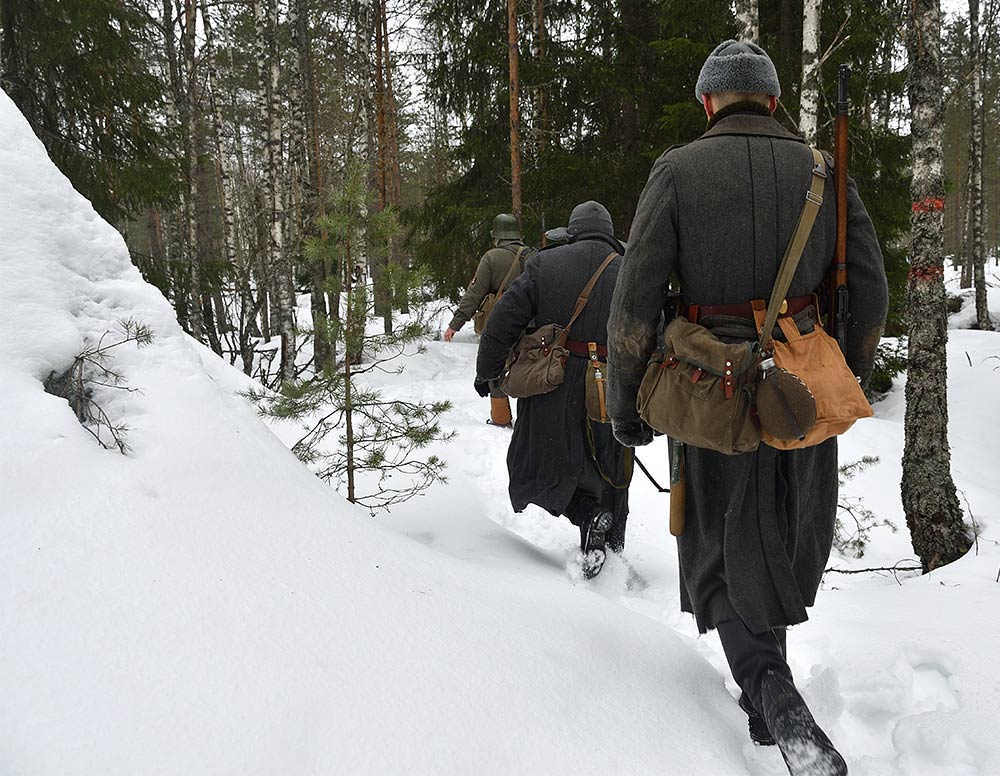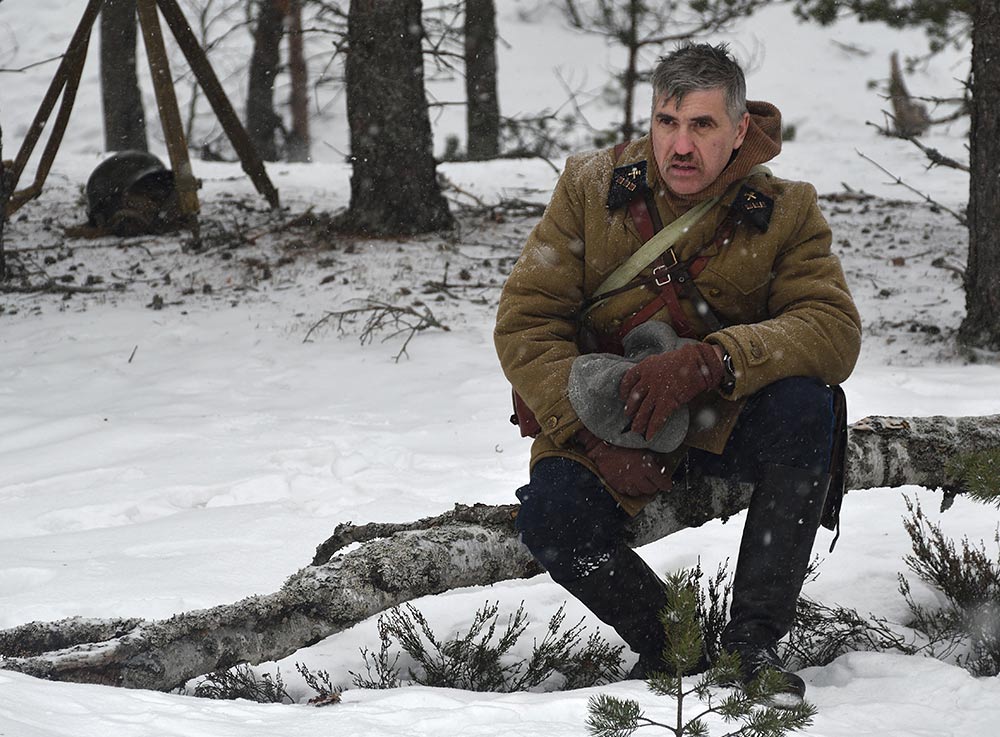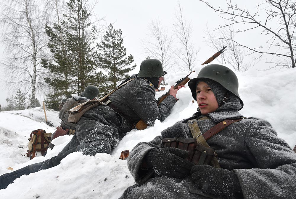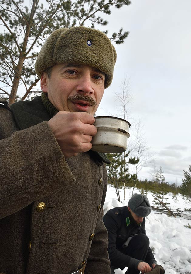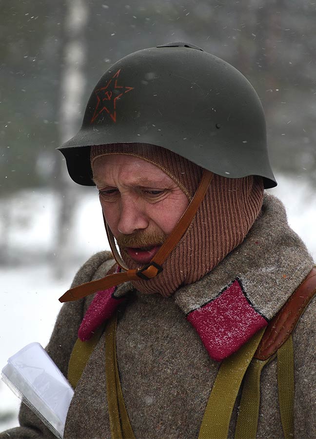 Реконструкция сражения за высоту 65.5 сектора Суммакюлля линии Маннергейма (Зимняя война, 1939-1940). Событие происходило на историческом месте сражения 6 марта 2021 года во время сильной метели...
