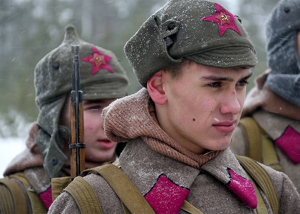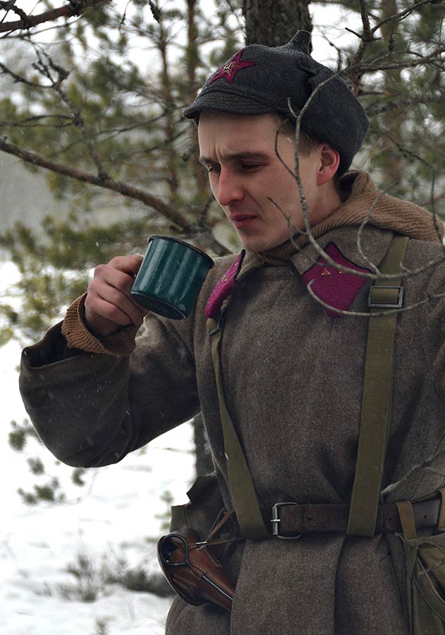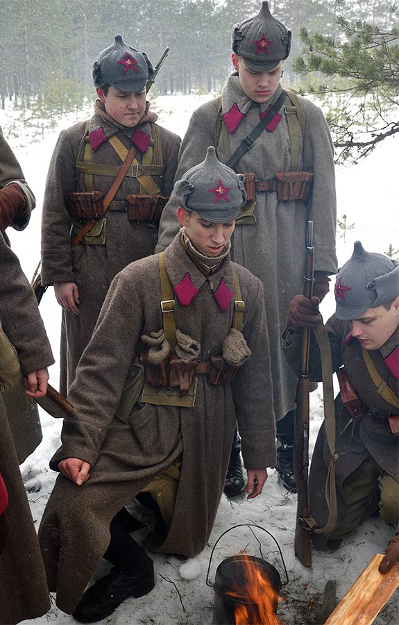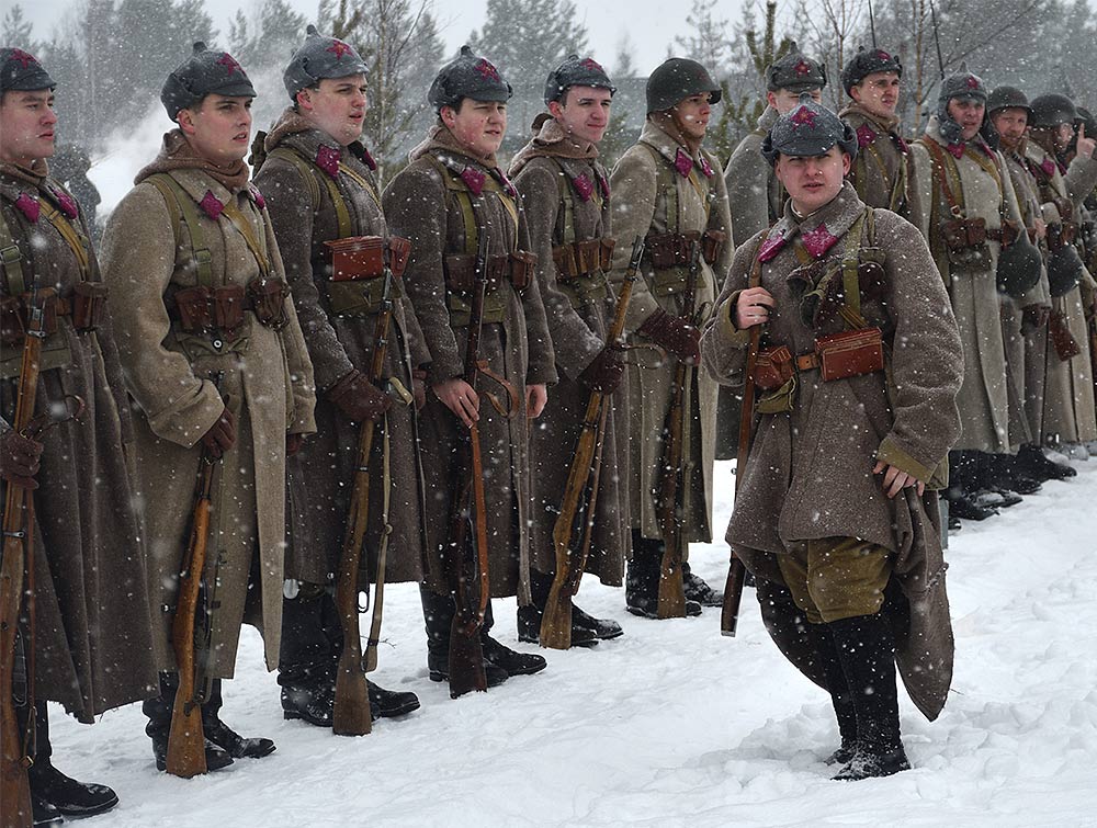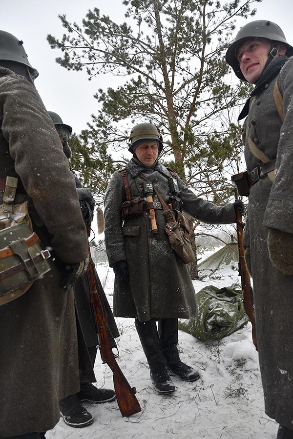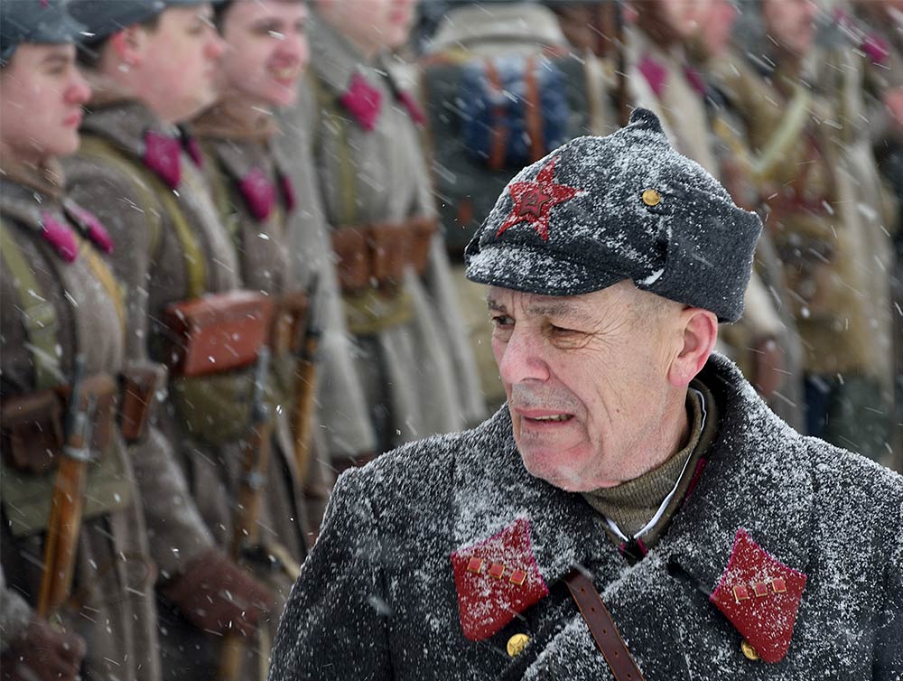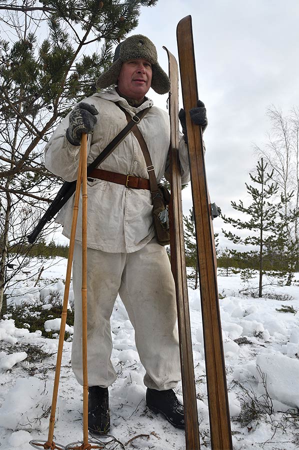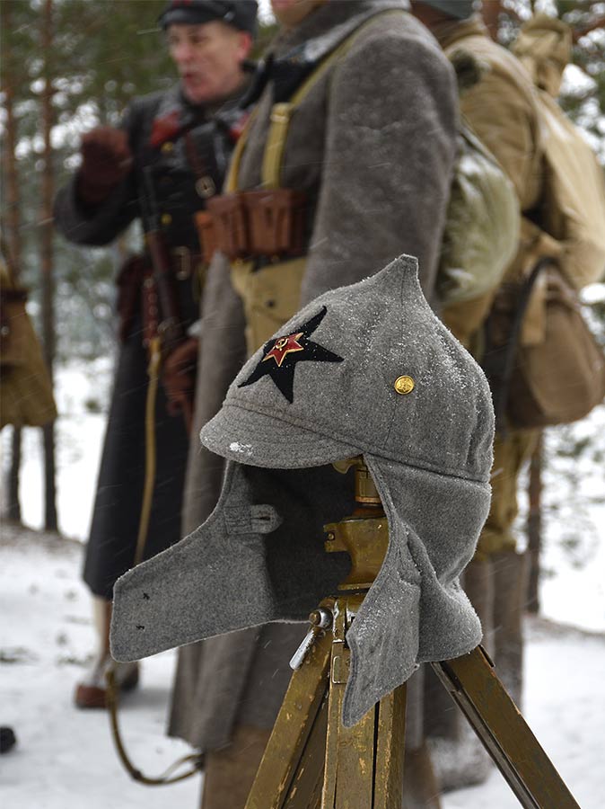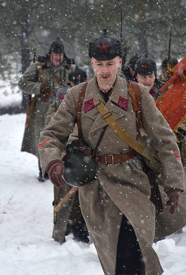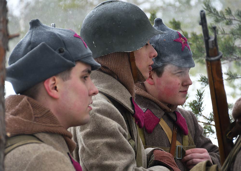 Реконструкция сражения за высоту 65.5 сектора Суммакюлля линии Маннергейма (Зимняя война, 1939-1940). Событие происходило на историческом месте сражения 6 марта 2021 года во время сильной метели...